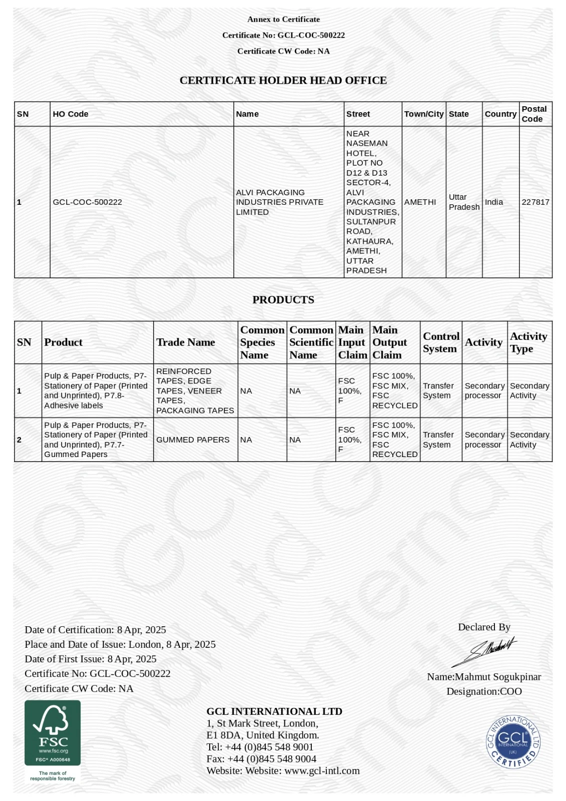 For compliance of FSC-STD-40-004 V3-1 FOR CHAIN OF CUSTODY CERTIFICATION and FSC-STD-50-001 V2-1 REQUIREMENTS FOR USE OF THE FSC TRADEMARKS BY CERTIFICATE HOLDERS